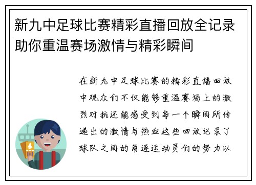 丰城三中足球比赛精彩直播全程回顾与精彩瞬间分享,是对这一盛大赛事的全面总结和细致剖析。本文将通过四个方面详细呈现比赛过程中的激动人心瞬间、战术分析、球员表现以及观众反响,带领读者感受到这场足球盛宴的魅力。首先,我们会回顾比赛的整体流程,包括开场热身到最后哨声响起的一系列事件;接着,将对双方球队的战术安排进行深入探讨,分析他们在比赛中所采取的策略;随后,我们将重点介绍几位表现突出的球员,他们在赛场上...